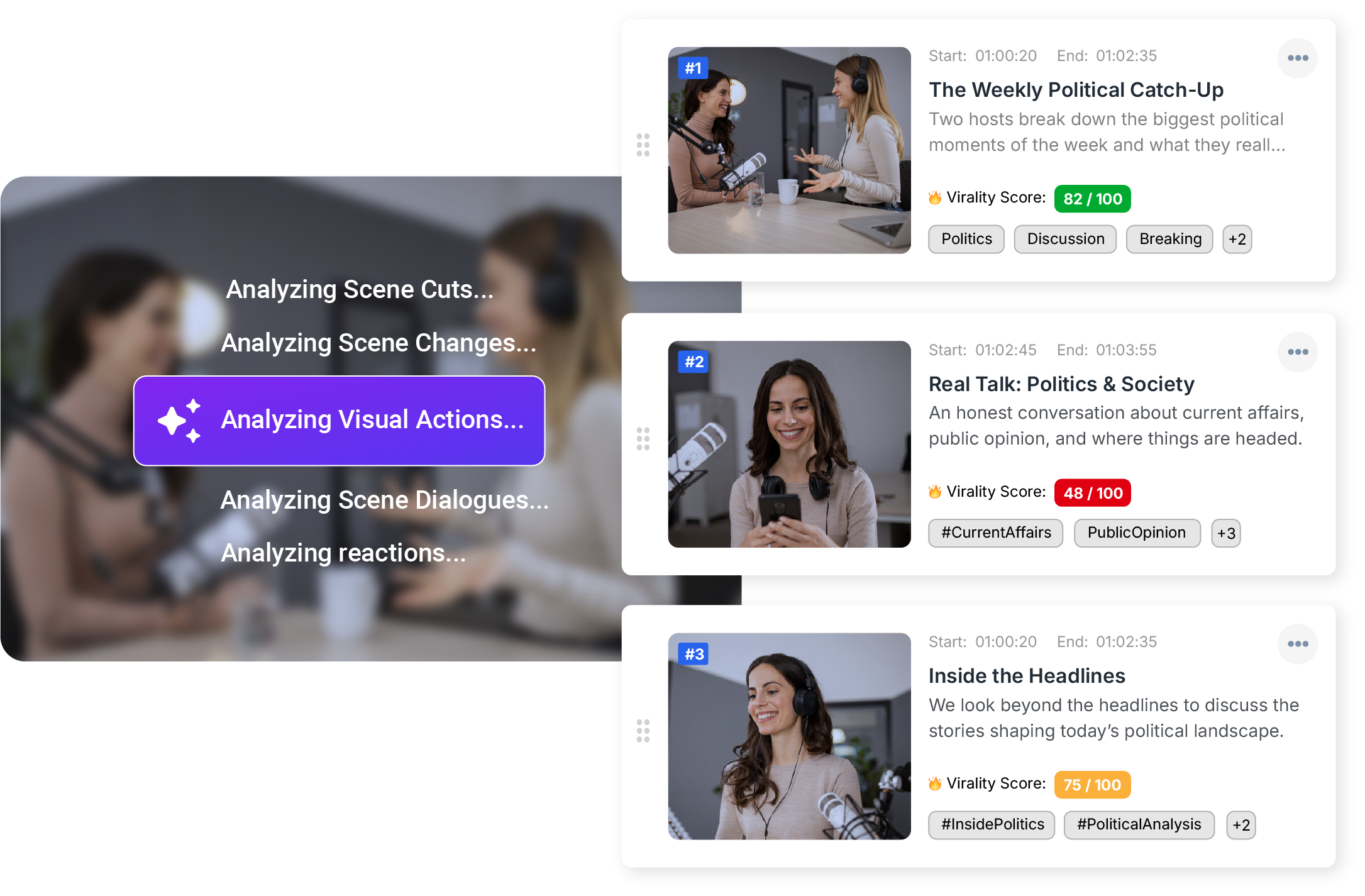 Turn podcasts, long videos, and livestreams into viral clips automatically.
